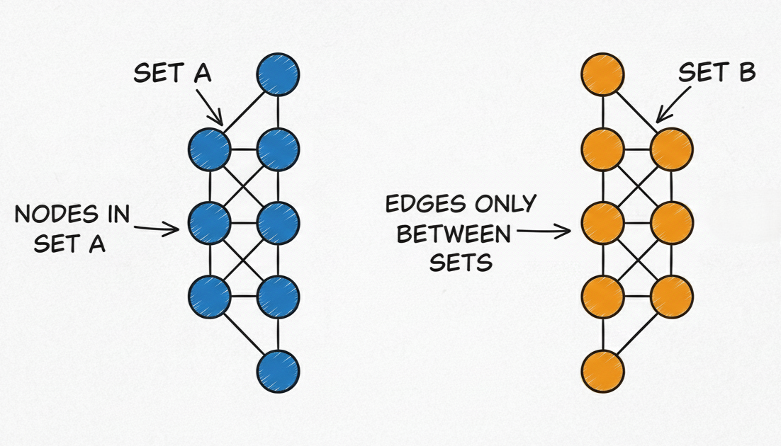 \[u \in V_1,\ v \in V_2 \quad \text{or} \quad u \in V_2,\ v \in V_1\]Key Properties